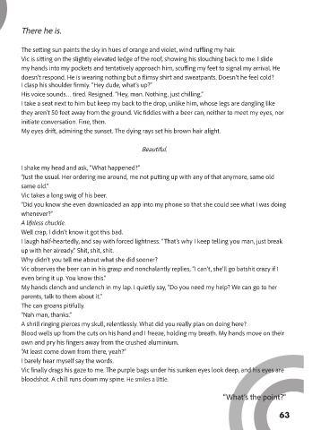 they aren’t 50 feet away from the ground. Vic fiddles with a beer can, neither to meet my eyes, nor
