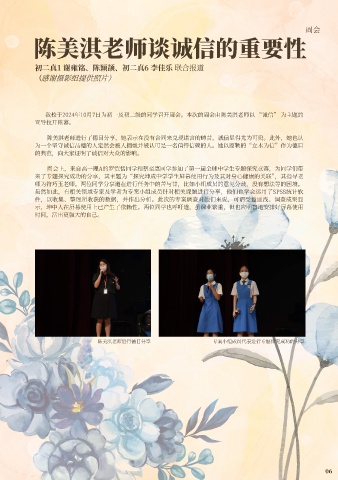 我校于2024年10⽉7⽇为初⼀及初⼆级的同学召开周会。本次的周会由陈美淇⽼师以 “诚信” 为主题的