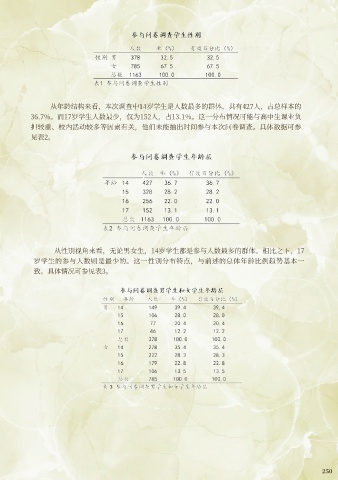 从年龄结构来看,本次调查中14岁学⽣是⼈数最多的群体,共有427⼈,占总样本的 36.7%。而17岁学⽣⼈数最少,仅为152⼈,占13.1%。这⼀分布情况可能与⾼中⽣课业负 担较重、校内活动较多等因素有关,他们未能抽出时间参与本次问卷调查。具体数据可参 ⻅表2。 从性别视⻆来看,⽆论男⼥⽣,14岁学⽣都是参与⼈数最多的群体。相⽐之下,17 岁学⽣的参与⼈数则是最少的。这⼀性别分布特点,与前述的总体年龄⽐例趋势基本⼀ 致。具体情况可参⻅表3。