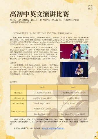 进⾏演讲。此次有幸邀请到Ms. Malar,Ms. Jasmine以及Ms. Jayasalinee成为初中组的评审⽼师;而⾼中