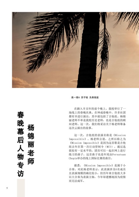 在踏入辛丑年的前个晚上,我校举行了一 杨老师说,《Mission Impossible》的双重主旋律,由刘