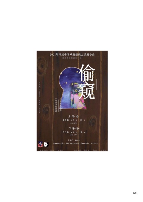 本校戏剧组于2021年9月11日以及18日举办了线上读剧小品《偷窥》。本社有