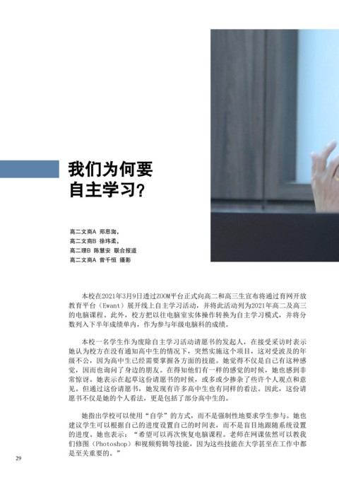 的电脑课程。此外,校方把以往电脑室实体操作转换为自主学习模式,并将分 感,体会事物发展的意义及价值。校长表示,自主学习虽占用学生的时间,但也能让他们学
