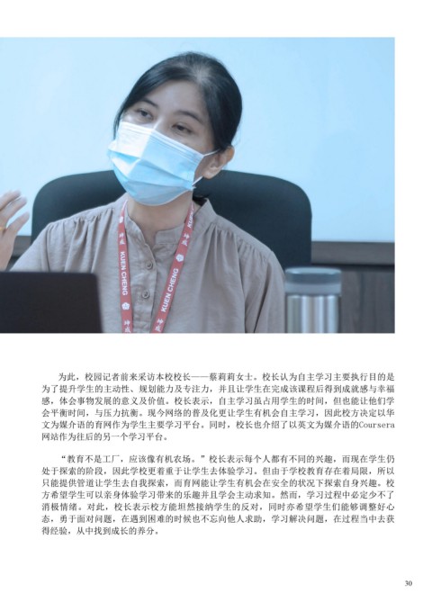 本校在2021年3月9日透过ZOOM平台正式向高二和高三生宣布将通过育网开放 为此,校园记者前来采访本校校长——蔡莉莉女士。校长认为自主学习主要执行目的是