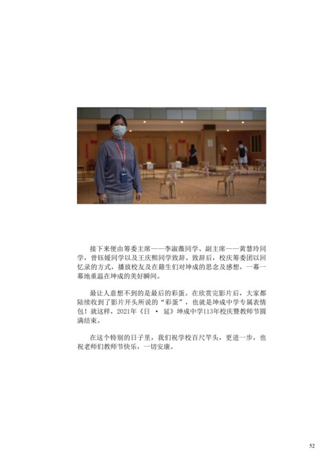 备了教师节礼物——折叠式桌子以感谢老师们对学校的无私奉 学,曾钰媛同学以及王庆熙同学致辞。致辞后,校庆筹委团以回
