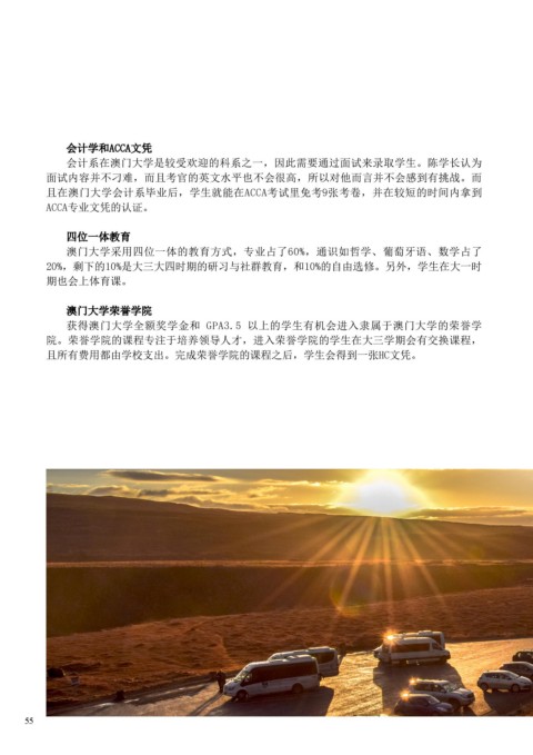 澳门大学采用四位一体的教育方式,专业占了60%,通识如哲学、葡萄牙语、数学占了 陈学长本身的英语能力较好,所以在选择大学时,就锁定了以英语授课的国家。经过一