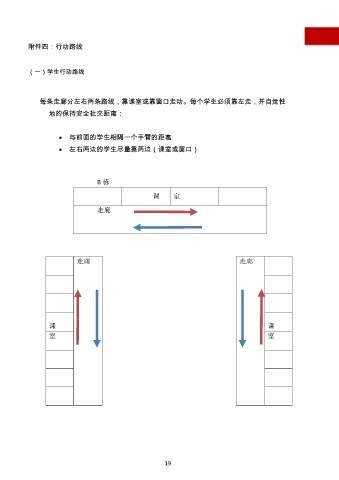 附件四:行动路线 (一)学生行动路线 每条走廊分左右两条路线,靠课室或靠窗口走动。每个学生必须靠左走,并自觉性 地的保持安全社交距离: 与前面的学生相隔一个手臂的距离 左右两边的学生尽量靠两边(课室或窗口) B栋 课室 走廊 A 走廊 走廊 C 栋 栋 课课 室室 19