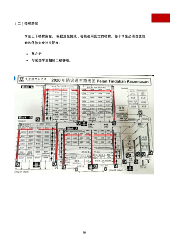 (二)楼梯路线 学生上下楼梯靠左。 根据逃生路线,每班使用固定的楼梯。每个学生必须自觉性 地的保持安全社交距离: 靠左走 与前面学生相隔三级梯级。 20