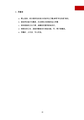 3. 用餐者 a. 禁止堂食,校方提供包伙食方式给学生订餐,参照“学生防疫”准则。 b. 请老师自备打包餐具,在足够社交距离的地方用餐 c. 保持高度的卫生习惯,就餐前后要用肥皂洗手。 d. 照顾自身卫生,鼓励用餐者自行准备汤匙、叉、筷子等餐具。 e. 用餐时,少交流,专心吃饭。 28
