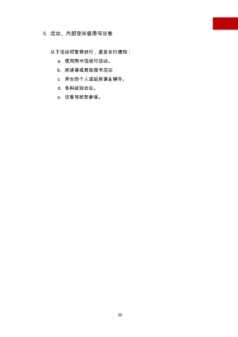 5. 活动、内部空间借用与访客 以下活动将暂停进行,直至另行通知: a. 使用图书馆进行活动。 b. 阅读课或班级借书活动 c. 师生的个人或组别课业辅导。 d. 各科组别会议。 e. 访客与校友参观。 30