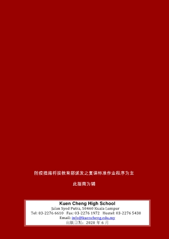 防疫措施将按教育部颁发之复课标准作业程序为主 此指南为辅 Kuen Cheng High School Jalan Syed Putra, 50460 Kuala Lumpur Tel: 03-2276 6610 Fax: 03-2276 1972 Hostel: 03-2276 5430 Email: info@kuencheng.edu.my 出版日期:332020 年 6 月