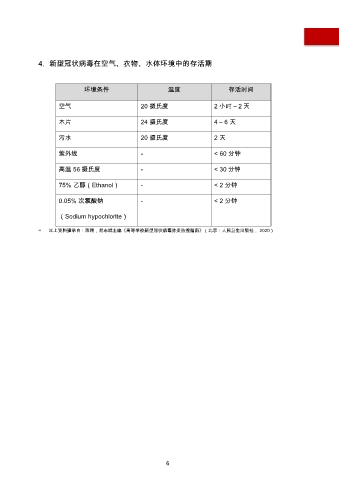 4. 新型冠状病毒在空气、衣物、水体环境中的存活期 环境条件 温度 存活时间 空气 20 摄氏度 2 小时 – 2 天 木片 24 摄氏度 4–6天 污水 20 摄氏度 2天 紫外线 - < 60 分钟 高温 56 摄氏度 - < 30 分钟 75% 乙醇(Ethanol) - < 2 分钟 0.05% 次氯酸钠 - < 2 分钟 (Sodium hypochlorite) ◎ 以上资料摘录自:陈翔,胡志斌主编《高等学校新型冠状病毒肺炎防控指南》(北京:人民卫生出版社, 2020) 6