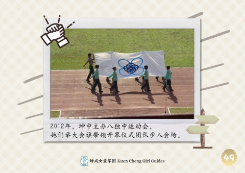 2012年,坤中主办八独中运动会, 她们举大会旗带领开幕仪式团队步入会场。 49 49 坤成女童军团 Kuen Cheng Girl Guides