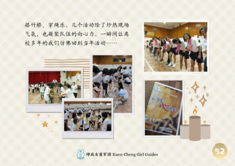 搭竹桥、穿绳乐,几个活动除了炒热现场 气氛,也凝聚队伍的向心力,一瞬间让离 校多年的我们仿佛回到当年活动…… 52 52 坤成女童军团 Kuen Cheng Girl Guides