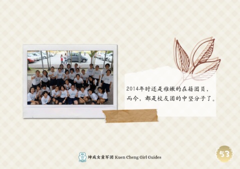 2014年时还是稚嫩的在籍团员, 而今,都是校友团的中坚分子了。 53 53 坤成女童军团 Kuen Cheng Girl Guides