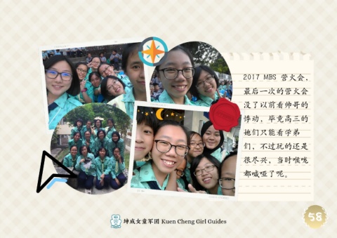 2017 MBS 营火会, 最后一次的营火会 没了以前看帅哥的 悸动,毕竟高三的 她们只能看学弟 们,不过玩的还是 很尽兴,当时喉咙 都喊哑了呢。 58 58 坤成女童军团 Kuen Cheng Girl Guides