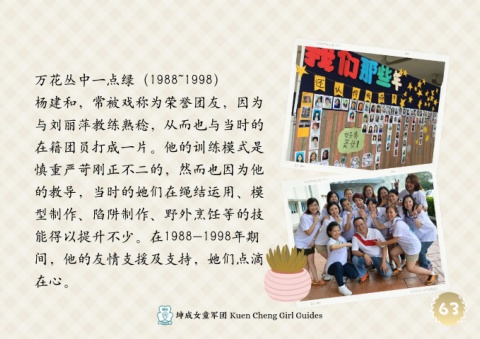 万花丛中一点绿(1988~1998) 杨建和,常被戏称为荣誉团友,因为 与刘丽萍教练熟稔,从而也与当时的 在籍团员打成一片。他的训练模式是 慎重严苛刚正不二的,然而也因为他 的教导,当时的她们在绳结运用、模 型制作、陷阱制作、野外烹饪等的技 能得以提升不少。在1988-1998年期 间,他的友情支援及支持,她们点滴 在心。 63 63 坤成女童军团 Kuen Cheng Girl Guides