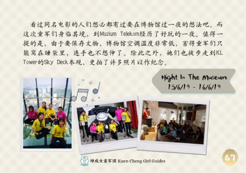 看过同名电影的人们想必都有过要在博物馆过一夜的想法吧。而 这次童军们身临其境,到Muzium Telekom经历了好玩的一夜。值得一 提的是,由于要保存文物,博物馆空调温度非常低,害得童军们只 能窝在睡袋里,连手也不想伸了。除此之外,她们也徒步走到KL Tower的Sky Deck参观,更拍了许多照片以作纪念。 Night In The Museum 15/6/19 - 16/6/19 67 67 坤成女童军团 Kuen Cheng Girl Guides