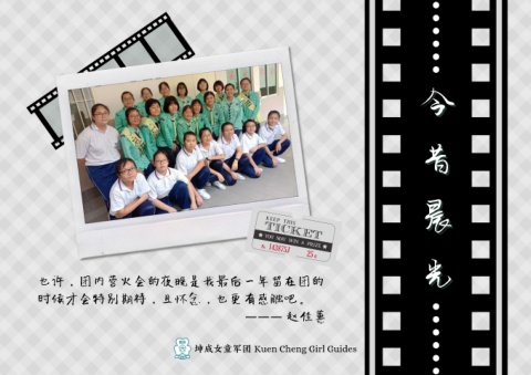 今 今 昔 昔 晨 晨 光 光 也许,团内营火会的夜晚是我最后一年留在团的 时候才会特别期待,且怀念,也更有感触吧。 ——— 赵佳蕙 坤成女童军团 Kuen Cheng Girl Guides
