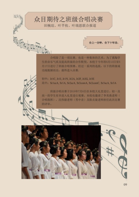 班级合唱决赛于2019年7月6日在本校大礼堂进行。初一及