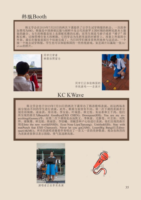 一年一度的国际周又回来啦,这里就让我们一 接一个地去试穿韩服。学生也可以体验韩国的一些传统游戏,如丢画片以赢取一张in-