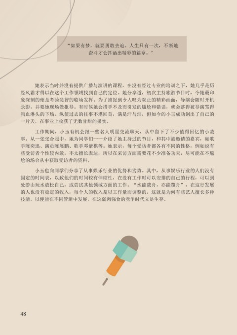 小玉也向同学们分享了从事娱乐行业的优势和劣势。其中,从事娱乐行业的人们没有 转跑道吧!