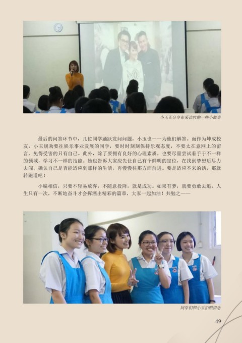 事。从一张张合照中,她为同学们一一介绍了她主持过的节目,和其中被邀请的嘉宾,如歌