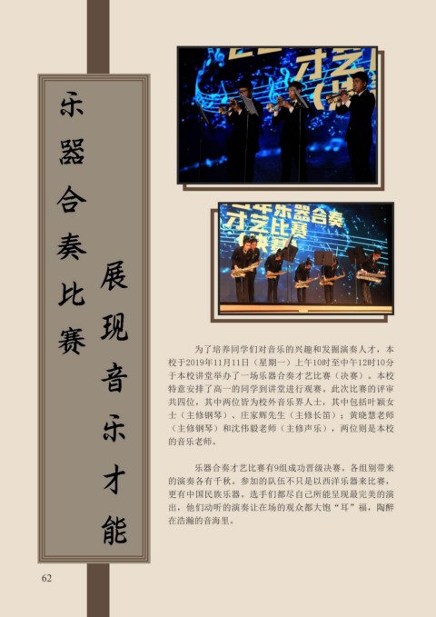 于本校讲堂举办了一场乐器合奏才艺比赛(决赛)。本校