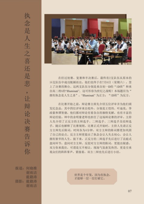 告 了自己的论点。反方主辩更提出了执念会让人失去初心,会让人