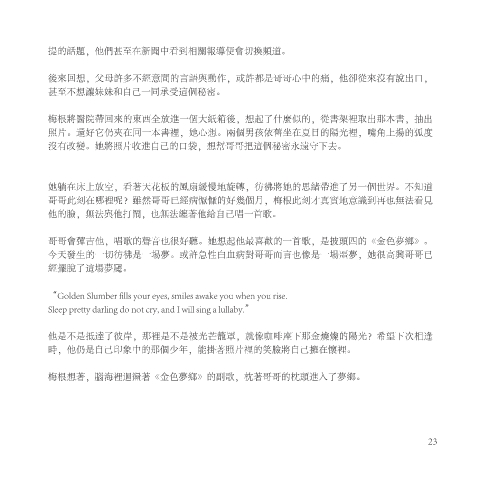哥哥會彈吉他,唱歌的聲音也很好聽。她想起他最喜歡的一首歌,是披頭四的《金色夢鄉》。