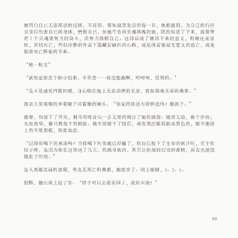 怕,害怕死亡,看似冷静的外表下隐藏着颤抖的心跳,或是推着她毫无意义的逃亡,或是