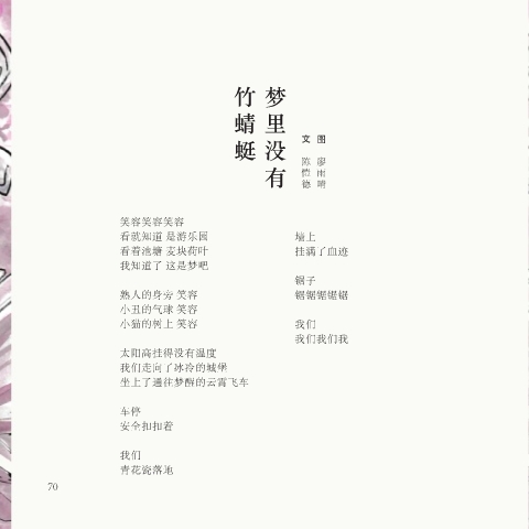 竹梦 文图 蜻里 蜓没 陈廖 愷雨 有 德晴 笑容笑容笑容 墙上 看就知道 是游乐园 挂满了血迹 看着池塘 麦块荷叶 我知道了 这是梦吧 锯子 锯锯锯锯锯 熟人的身旁 笑容 小丑的气球 笑容 我们 小猫的树上 笑容 我们我们我 太阳高挂得没有温度 我们走向了冰冷的城堡 坐上了通往梦醒的云霄飞车 车停 安全扣扣着 我们 青花瓷落地 70