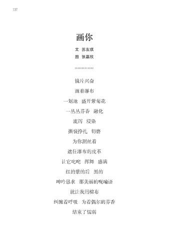 137 辑二 灵魂补缀 138 画你 文 苏友琪 图 张嘉欣 镜片兴奋 画着瀑布 一划地 盛开紫菊花 一丛丛芬香 融化 流泻 浸染 撕裂挣扎 切磨 为你割丝着 遮住瀑布的皮革 让它叱咤 挥舞 盛满 红的紫的后 黑的 呻吟恳求 那美丽的呢喃语 就让我用棉布 纠缠着呼吸 为着偶尔的芬香 结束了懦弱