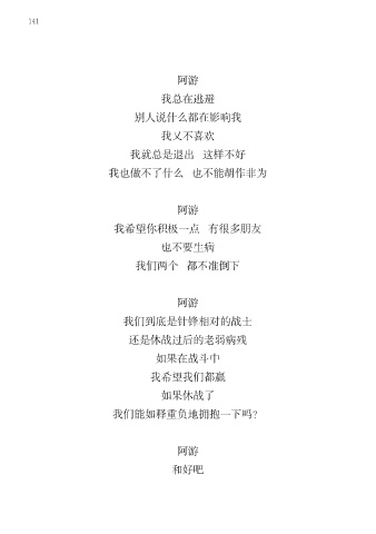 141 辑二 灵魂补缀 142 阿游 我总在逃避 别人说什么都在影响我 我又不喜欢 我就总是退出 这样不好 我也做不了什么 也不能胡作非为 阿游 我希望你积极一点 有很多朋友 也不要生病 我们两个 都不准倒下 阿游 我们到底是针锋相对的战士 还是休战过后的老弱病残 如果在战斗中 我希望我们都赢 如果休战了 我们能如释重负地拥抱一下吗? 阿游 和好吧