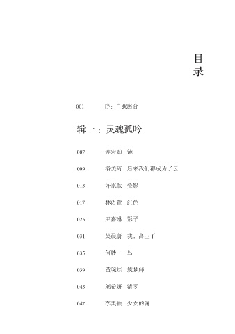 目 录 001 序:自我磨合 辑一 :灵魂孤吟 007 连宏勋 | 镜 009 潘美琦 | 后来我们都成为了云 013 许家欣 | 叠影 017 林语萱 | 红色 025 王嘉琳 | 影子 031 吴晨蔚 | 我,高三了 035 何妙一 | 鸟 039 黄琬媇 | 筑梦师 043 刘希妍 | 清零 047 李美颖 | 少女的魂
