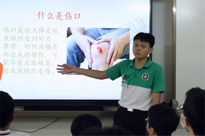 在伤口处理(Wound Management)的教学环节中,讲解员们耐心地向同学们讲解伤口的定义及种类,包括切伤、划伤、瘀伤、擦伤、刺伤以及枪伤等。与此同时,讲解员们也亲自示范不同伤口的正确处理方式及步骤。例如,在处理切伤时,应先进行止血,再清洁伤口,最后进行适当包扎,以避免伤口受到感染。