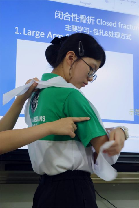 随后,讲解员进一步介绍骨折的种类,包括开放性骨折、闭合性骨折、旁弯骨折以及粉碎性骨折,让同学们对不同类型的骨折有更清晰的认识。讲解员也提到,若关节发生脱臼,同样需要及时进行适当的固定与处理。在讲解急救方法时,讲解员也现场示范了多种包扎及固定方式。例如,在手部骨折或关节脱臼时,可使用 Large Arm Sling 或 Elevation Sling 进行固定与支撑;若是腿部骨折,则需要使用适当的方法固定受伤部位,以减少移动,避免伤势进一步恶化。