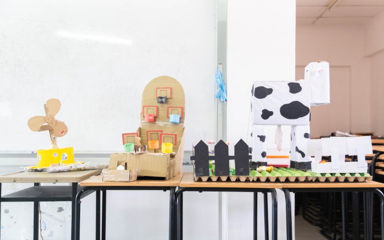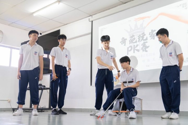 在决赛环节中,各组轮流上台展示自己的创意成果。来自高三纯商C班的小组首先带来了“多功能推车”,主打家用与实用性,通过多种功能的结合,让日常生活更加方便。随后,高三纯商B班的小组呈现了他们设计的“多功能Scooter”,并以环保材料作为产品特色,在介绍设计理念的同时也强调环保的重要性。另一方面,高三文商B班的小组则带来了“垃圾分类投篮装置”,他们将垃圾分类与投篮游戏结合,希望通过更具趣味性的方式,提高大众对环保与垃圾分类的意识。