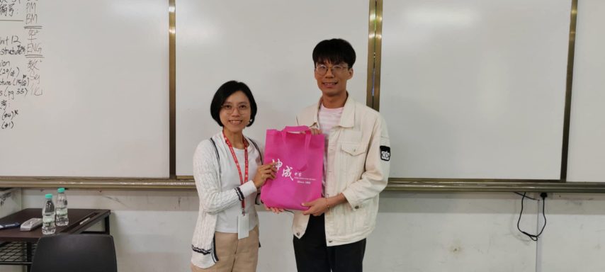 (图一:邓凯柔老师向陈玮伦先生致赠纪念品)