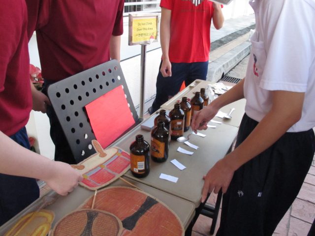 此外,管弦乐团设计“音乐家大挑战”互动游戏。摊主通过敲击不同音调的瓶子进行示范,同学们则在引导下模仿相应音调,在游戏中感受音乐的趣味与魅力。
