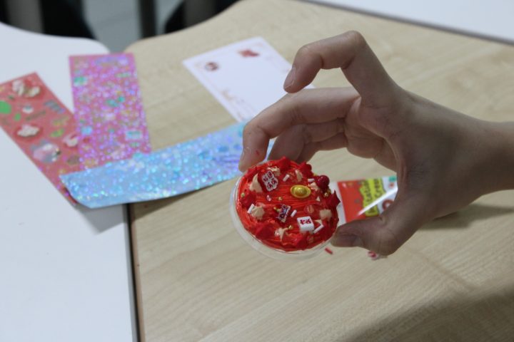 活动中,同学们在塑料容器及钥匙圈上挤出五彩奶油胶,并搭配麻将牌、财神爷、鞭炮等新春装饰,增添节庆气息。同时,主办单位也准备了英文字母贴纸,让同学们拼贴姓名,使作品更具个性与纪念意义。