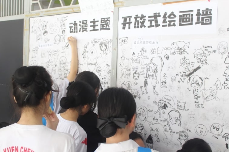 活动特别设置四面主题绘画墙,分别为“最喜欢的游戏角色”“动物拟人化”“自由创作”及“最喜欢的动漫角色”。每天两次下课期间,绘画区便迅速聚集起热爱创作的同学。大家手持画笔,或专注勾勒心仪角色,或以夸张笔触描绘拟人动物,更有同学尽情挥洒灵感,将奇思妙想呈现于墙面,现场气氛活跃,创意涌动。