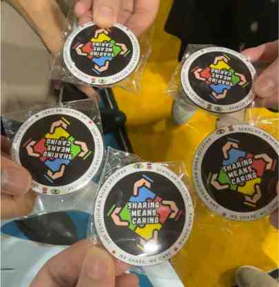 文良港特殊教育国民中学的师生赠予我们一份精心准备的礼物——一枚专属设计的纪念徽章。徽章上,两校的校徽与名称相依围成圈,并镌刻着“Sharing means Caring. We Share, We Care”的温暖字句。这份细致入微的心意,瞬间温暖了在场每一位坤成师生的心。
